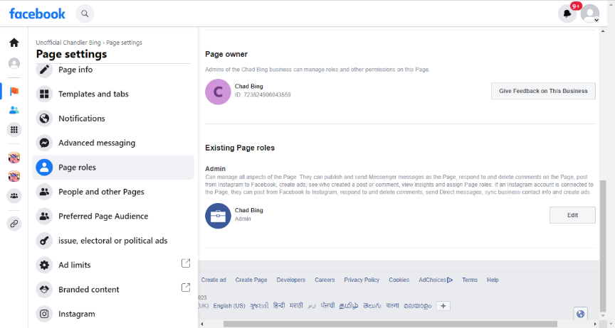 - You must have an admin role on the Facebook page associated with your Instagram Business account. To check your role, go to the Facebook page, click on Settings, and then select Page Roles.