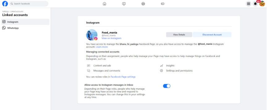 Ensure that the correct Facebook page is connected to your Instagram Business account. To verify this, switch to the relevant Facebook business page, navigate to the profile page, click on Manage to access the Professional dashboard, and then select Linked Accounts to view connected Instagram pages.