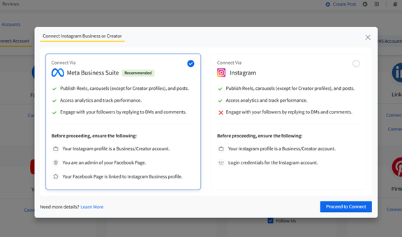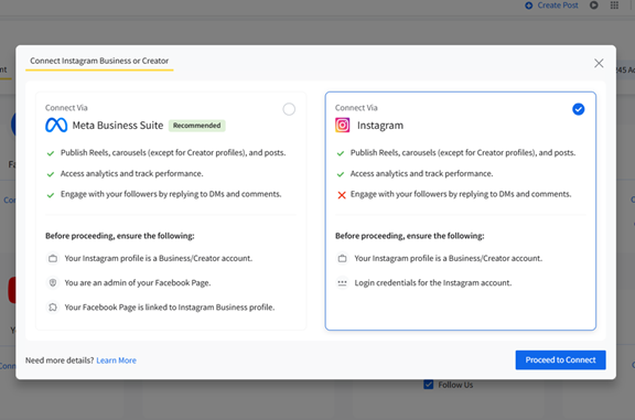 2. The pop-up will show two options: Connect via Meta Business Suite and Connect via Instagram. Select “Connect via Meta Business Suite” and click on “Proceed to Connect.”